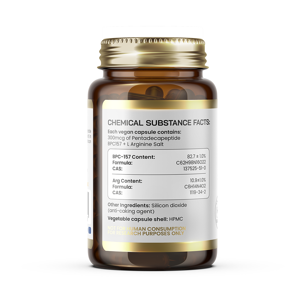 Ozarulab BPC-157 ARG contains 300 mcg of a high-purity synthetic pentadecapeptide (BPC-157) combined with L-Arginine salt in each vegetable capsule. This compound is provided in a convenient, encapsulated format for controlled laboratory and academic research settings.